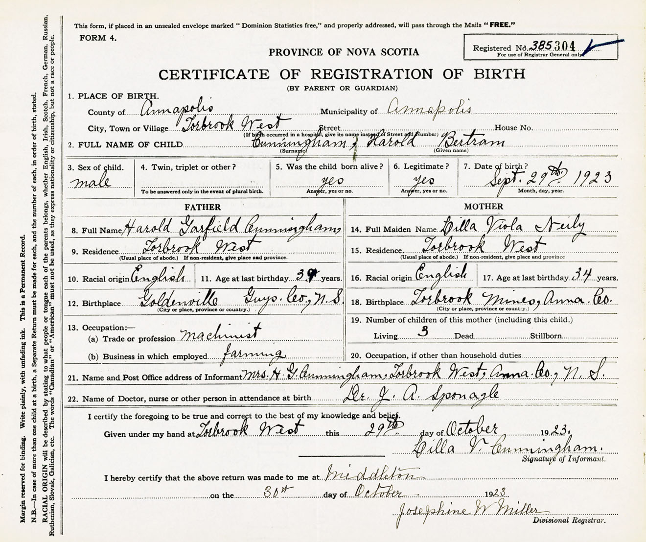 Male Birth Registration: Year: 1923 number: 38500304