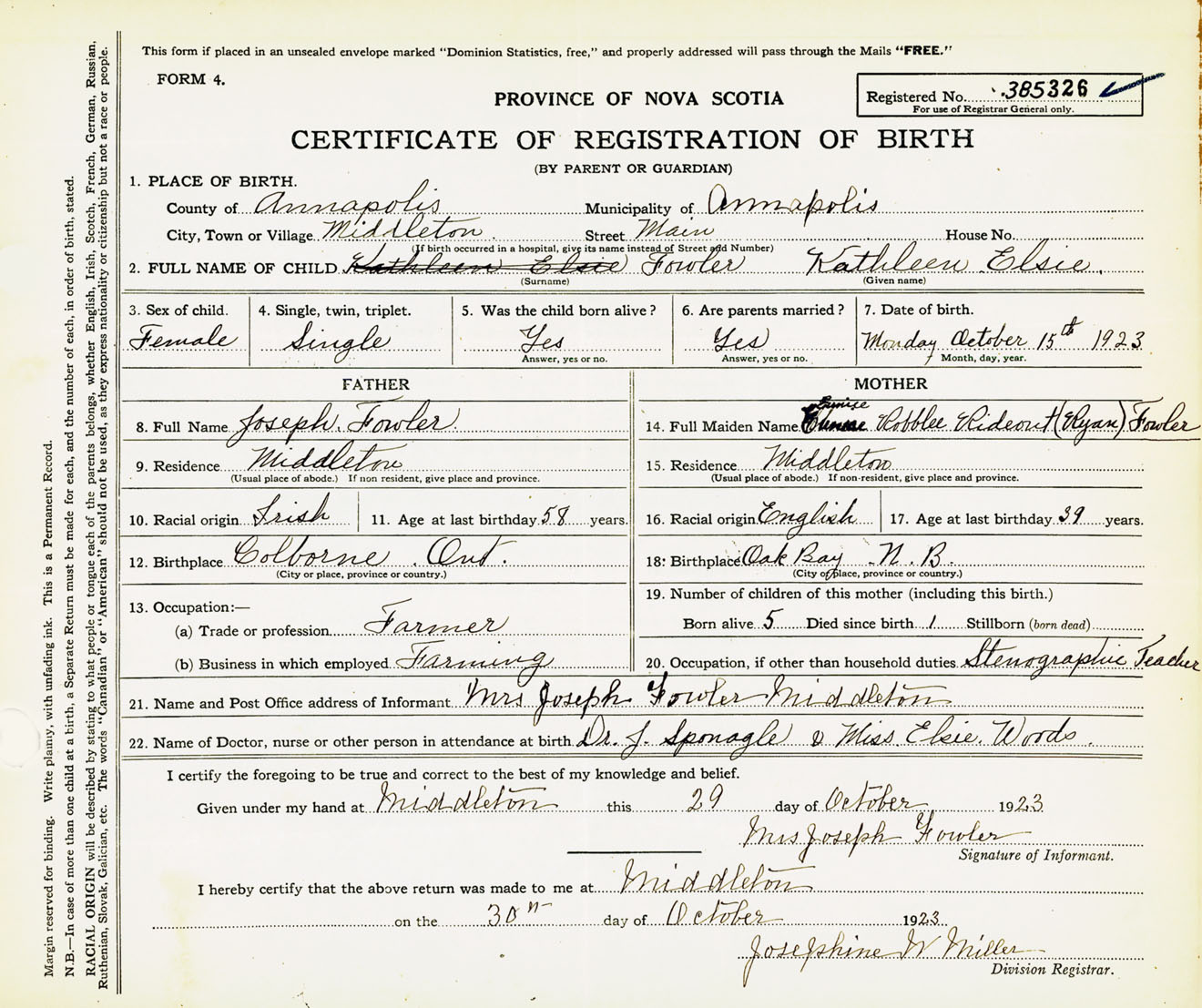 Female Birth Registration: Year: 1923 number: 38500326