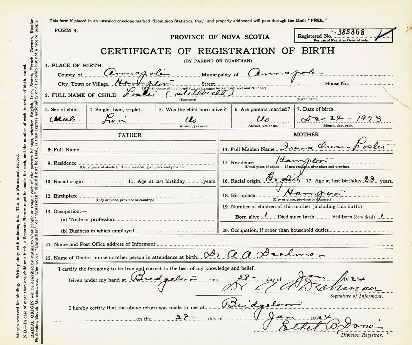 Male Birth Registration: Year: 1923 number: 38500368