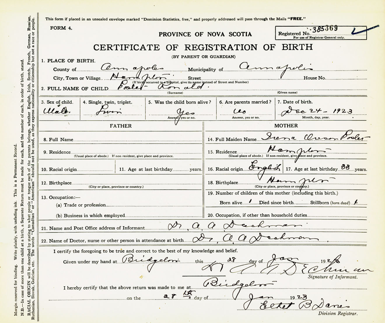 Male Birth Registration: Year: 1923 number: 38500369
