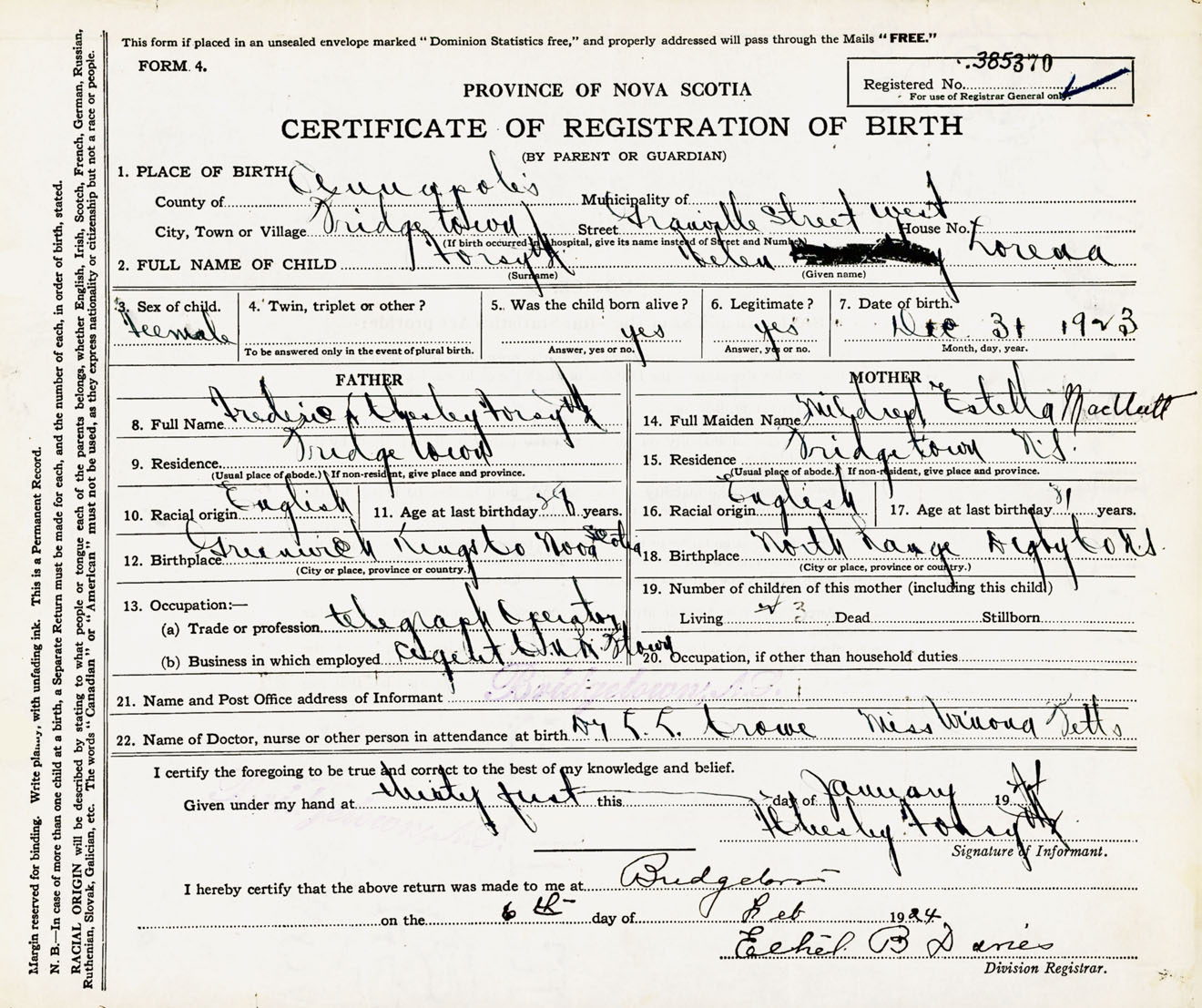 Female Birth Registration: Year: 1923 number: 38500370