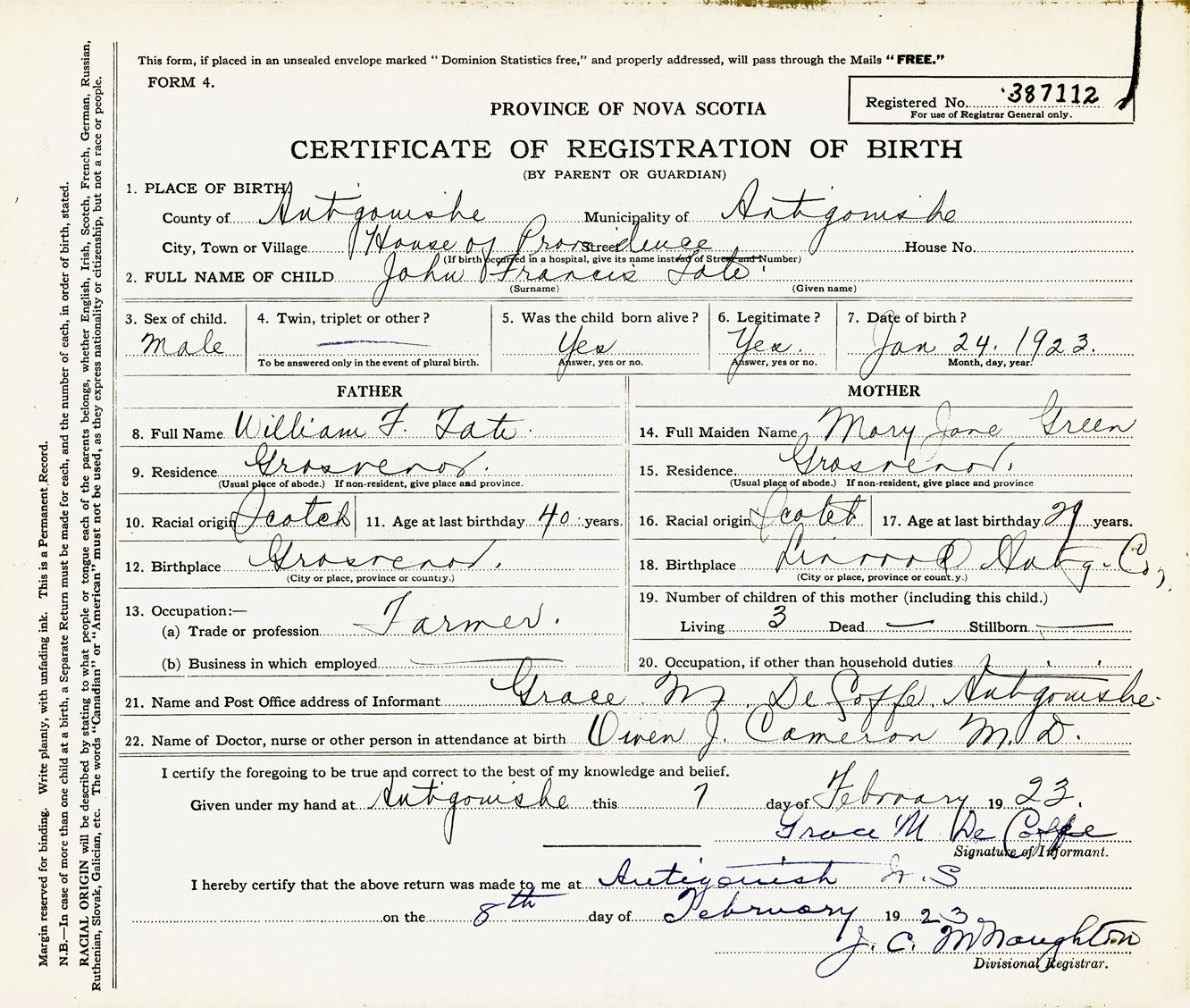 Male Birth Registration: Year: 1923 number: 38700112