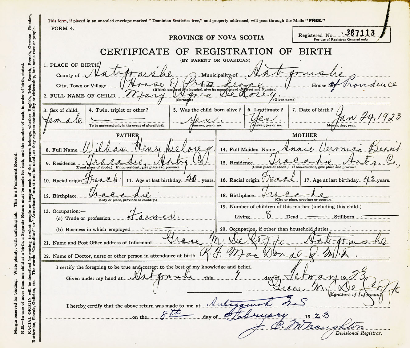 Female Birth Registration: Year: 1923 number: 38700113
