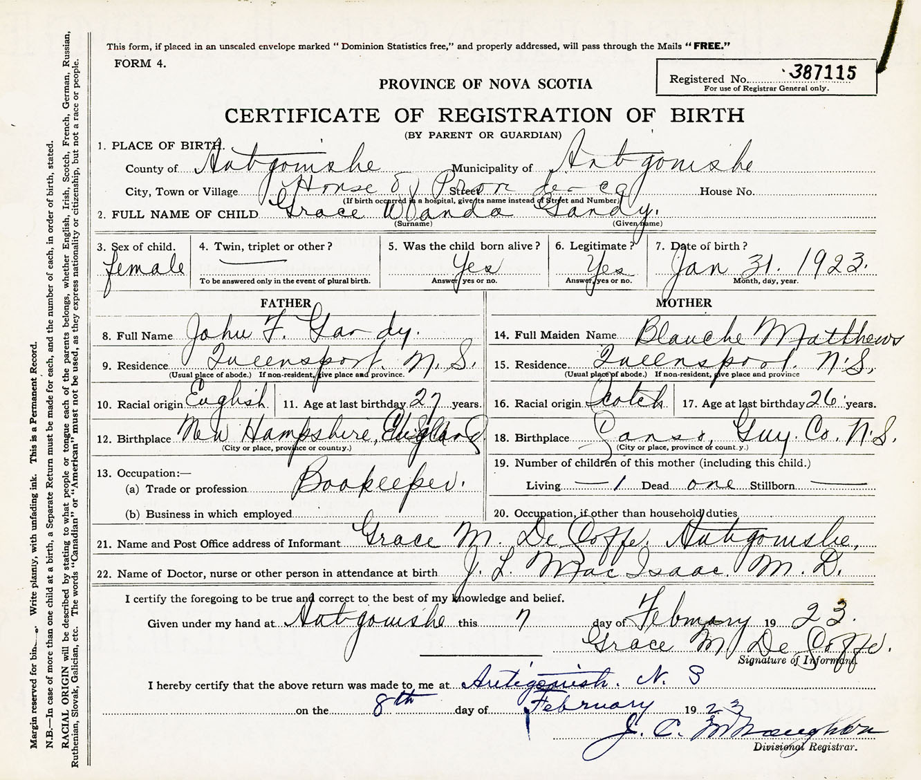 Female Birth Registration: Year: 1923 number: 38700115