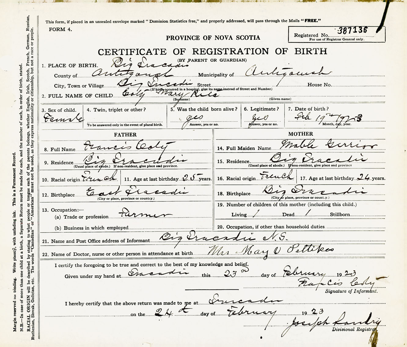 Female Birth Registration: Year: 1923 number: 38700136