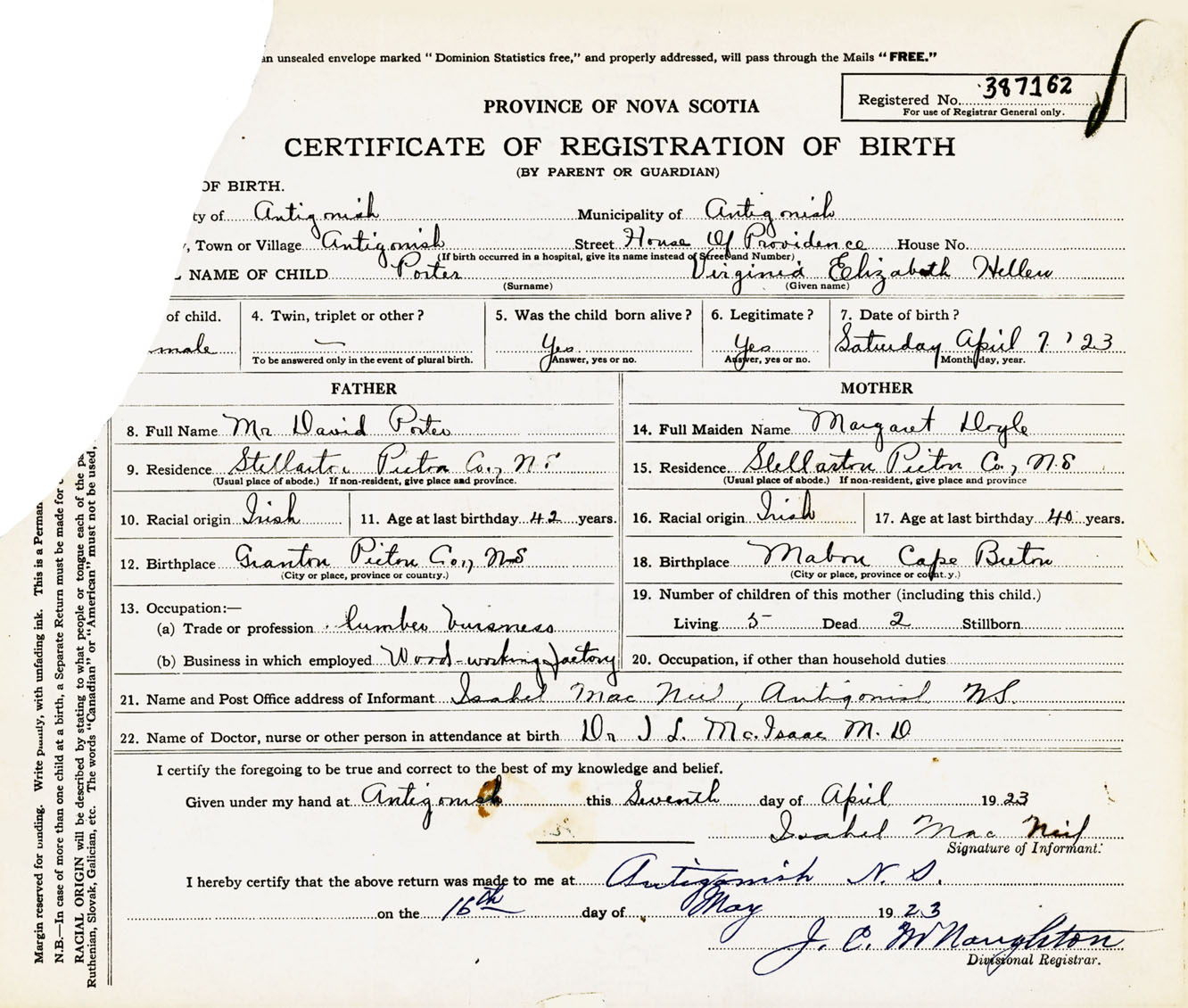 Female Birth Registration: Year: 1923 number: 38700162
