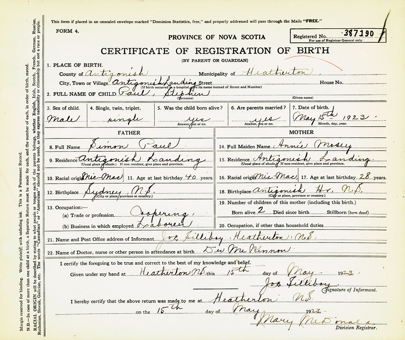 Male Birth Registration: Year: 1923 number: 38700190