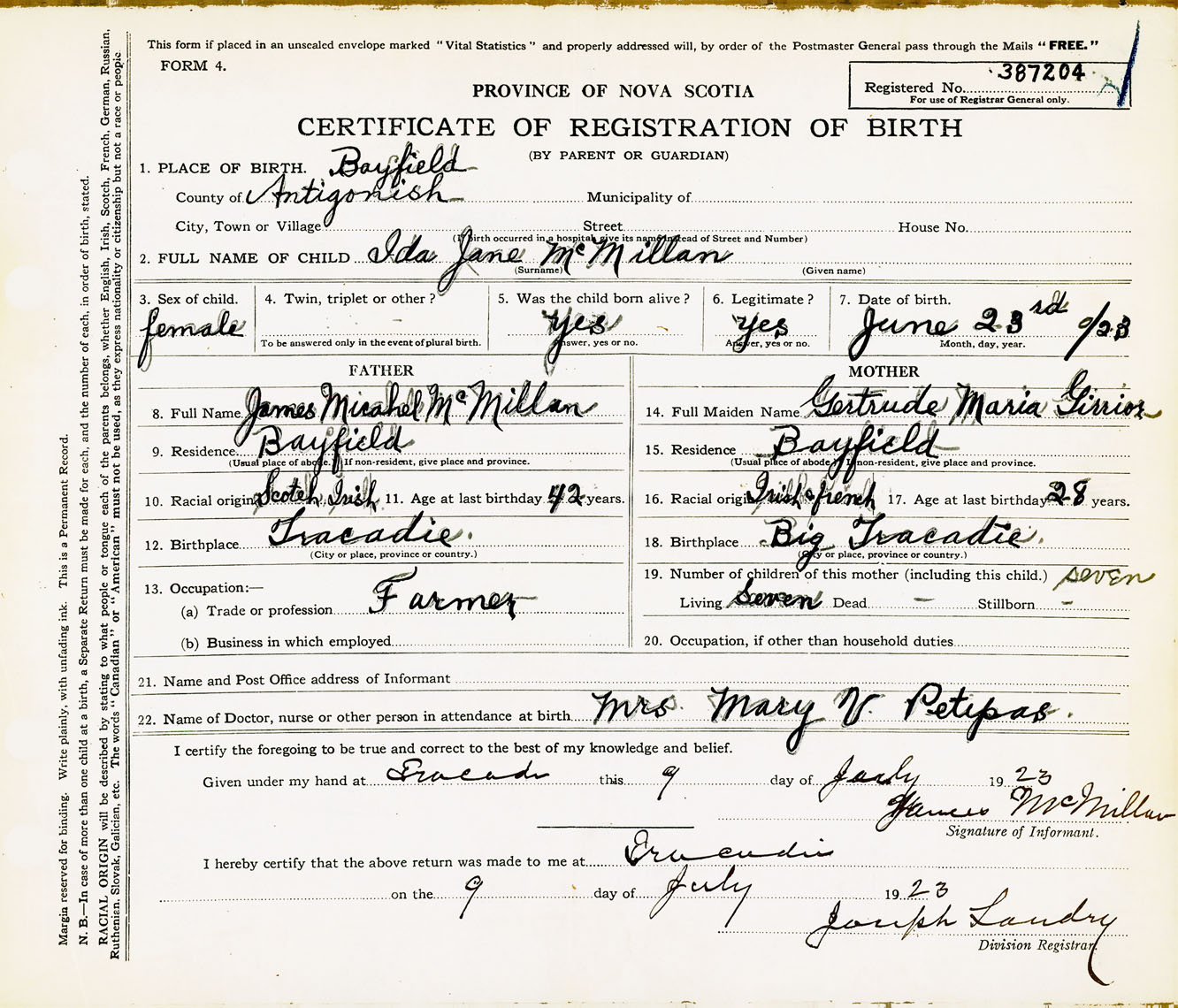 Female Birth Registration: Year: 1923 number: 38700204
