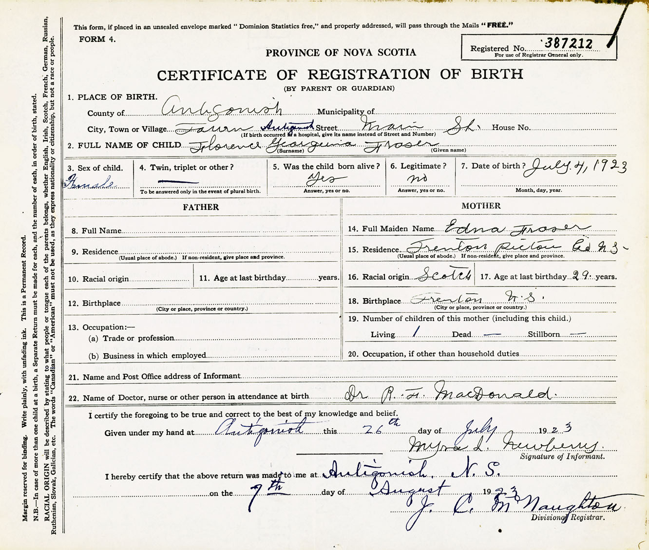Female Birth Registration: Year: 1923 number: 38700212