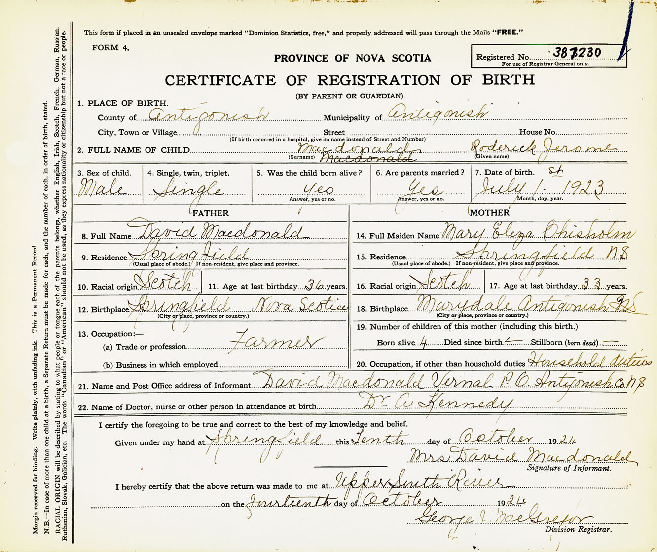 Male Birth Registration: Year: 1923 number: 38700230