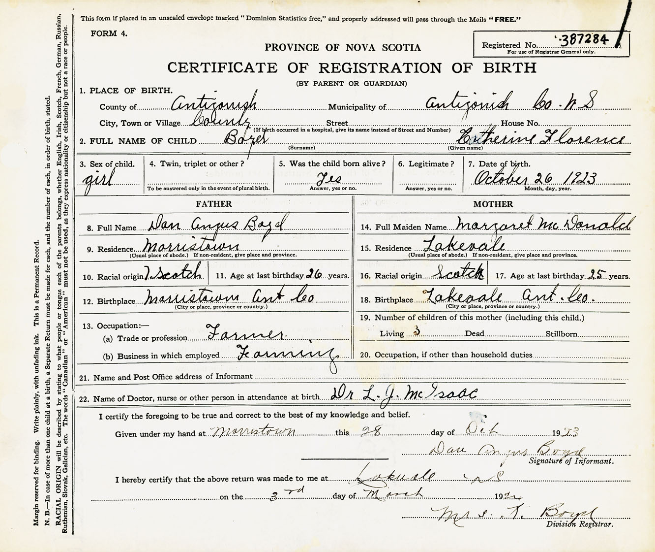 Female Birth Registration: Year: 1923 number: 38700284