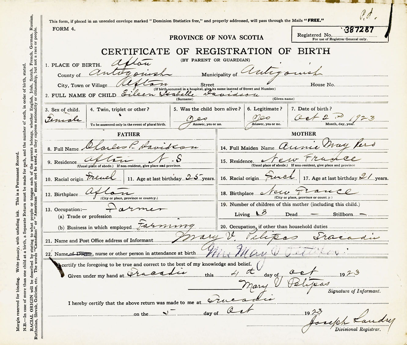 Female Birth Registration: Year: 1923 number: 38700287