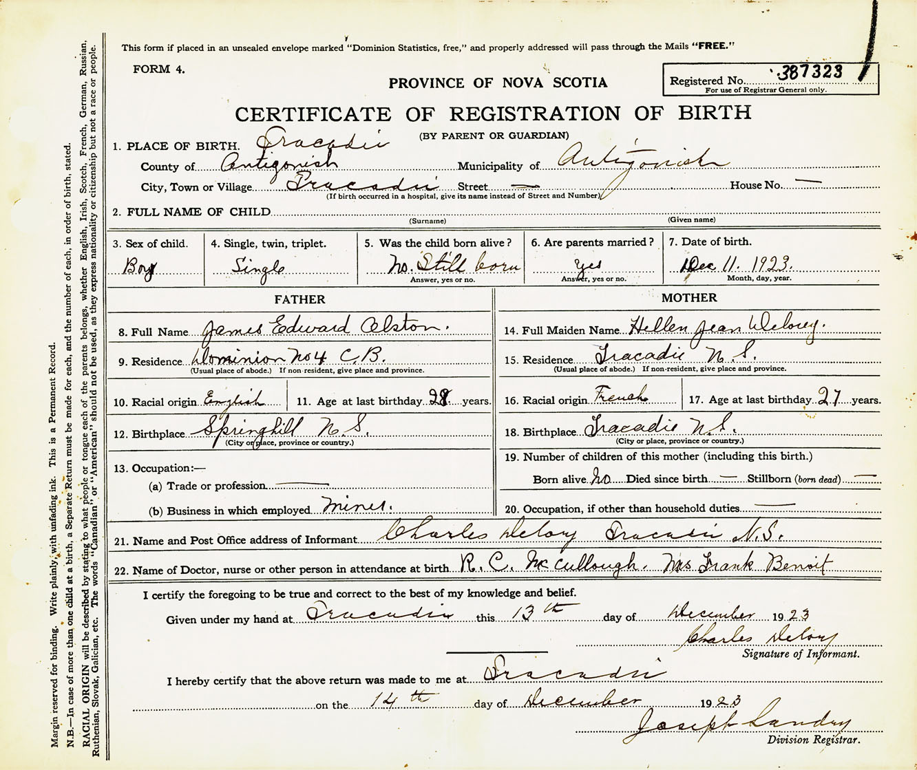 Male Birth Registration: Year: 1923 number: 38700323