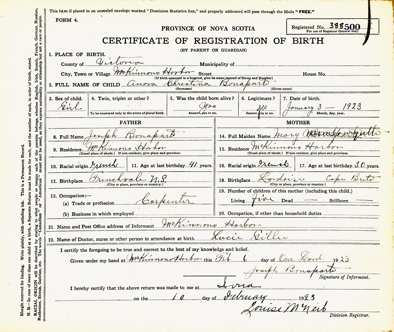 Female Birth Registration: Year: 1923 number: 38800500