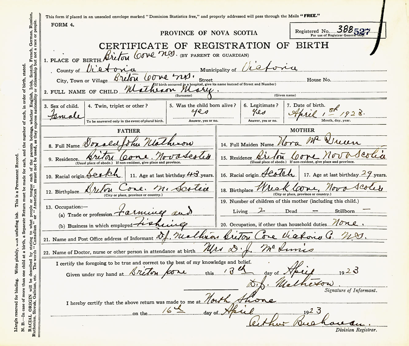 Female Birth Registration: Year: 1923 number: 38800527