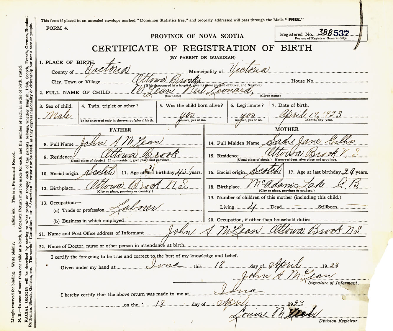 Male Birth Registration: Year: 1923 number: 38800537