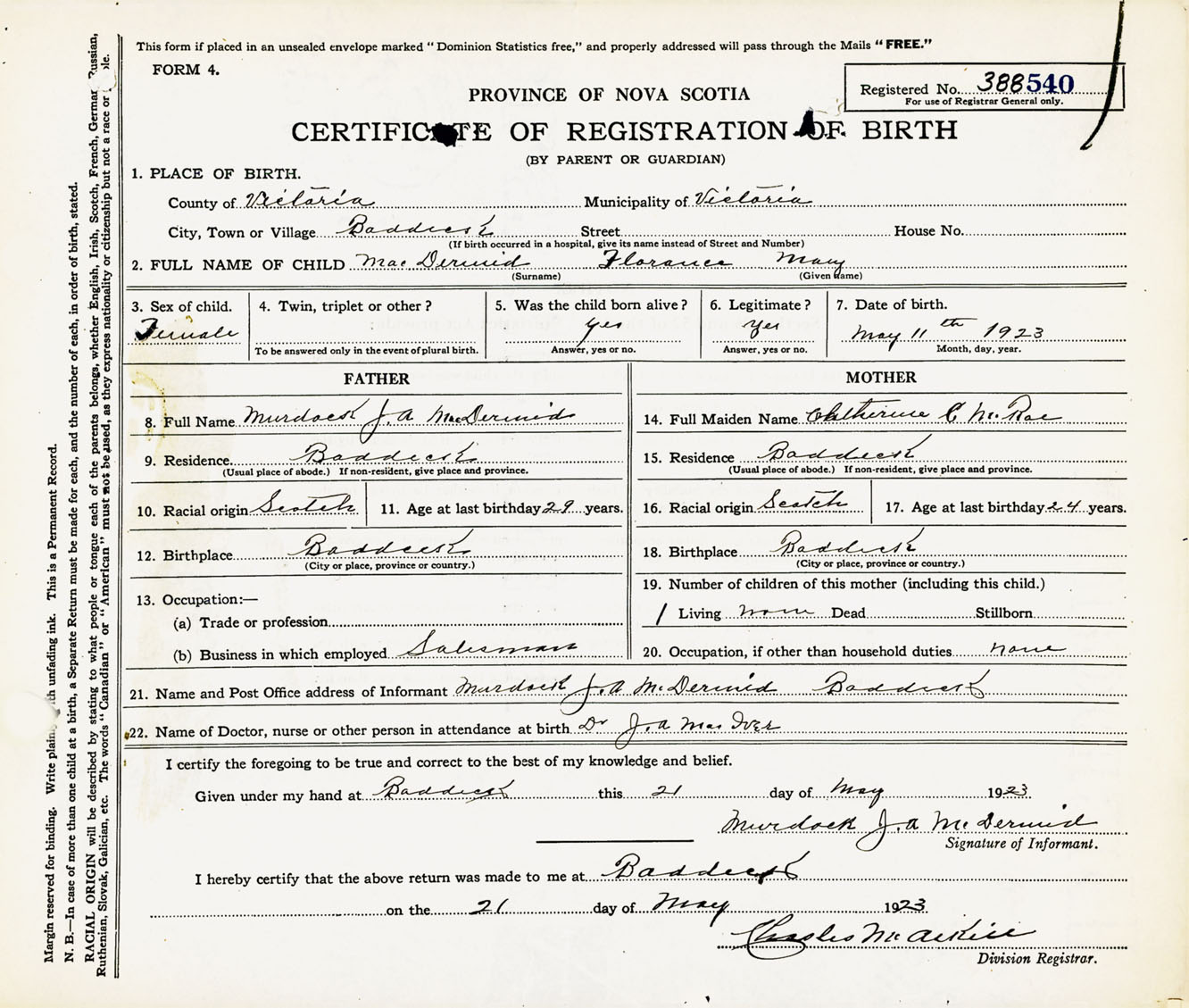 Female Birth Registration: Year: 1923 number: 38800540
