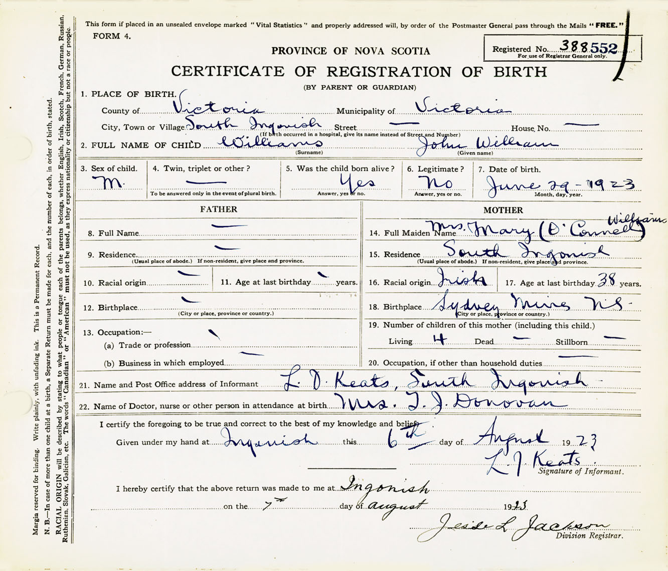 Male Birth Registration: Year: 1923 number: 38800552