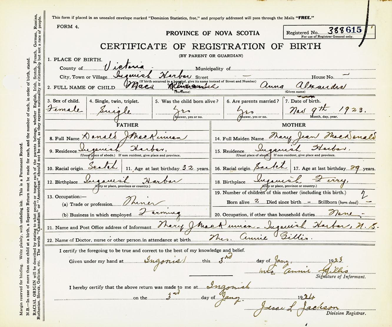 Female Birth Registration: Year: 1923 number: 38800615