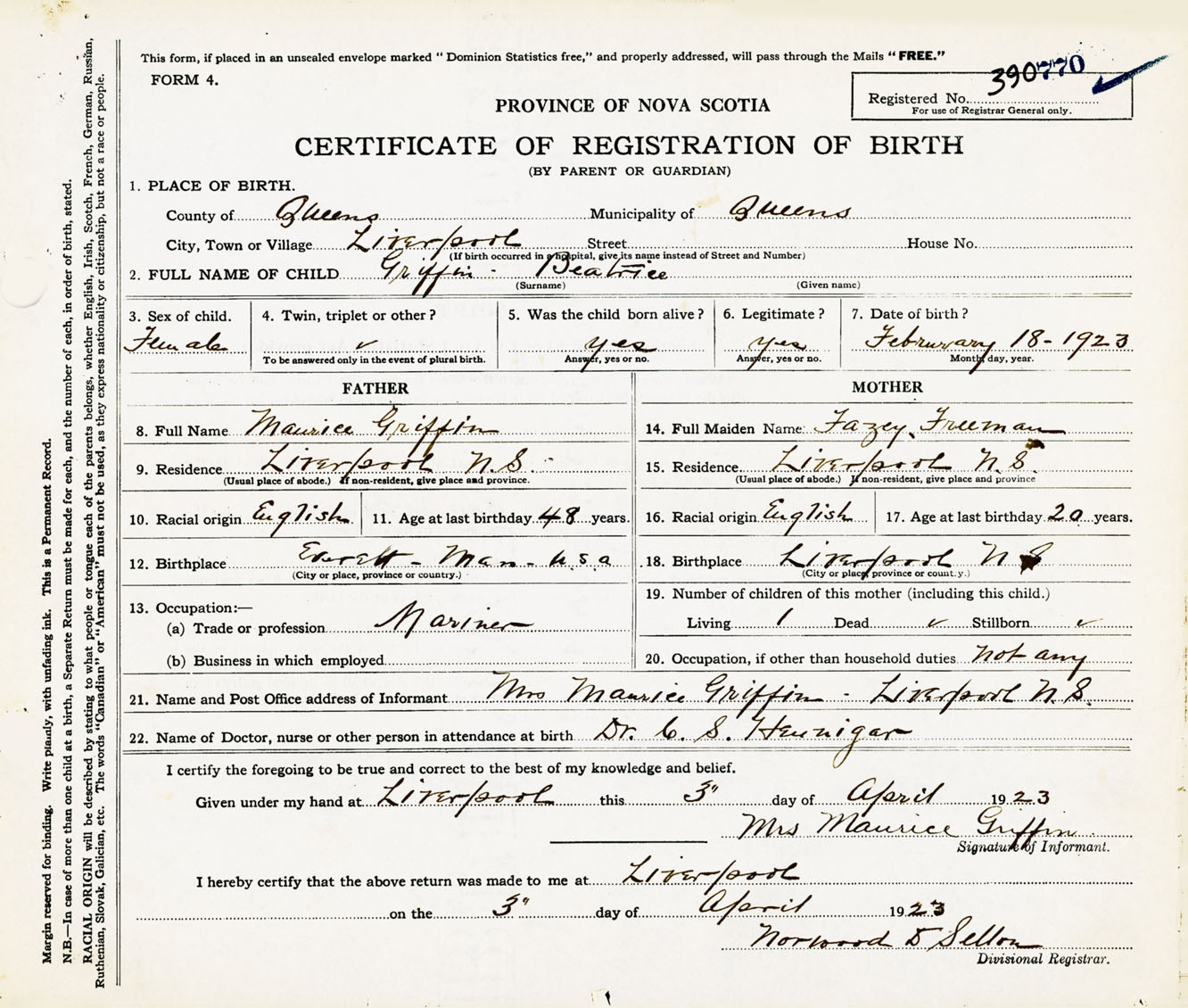 Female Birth Registration: Year: 1923 number: 39000770