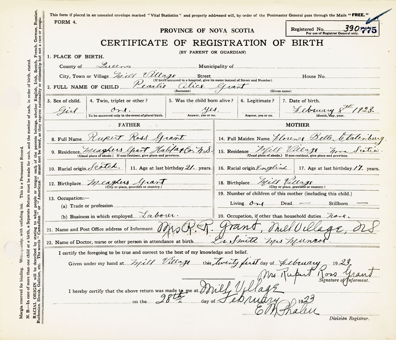 Female Birth Registration: Year: 1923 number: 39000775
