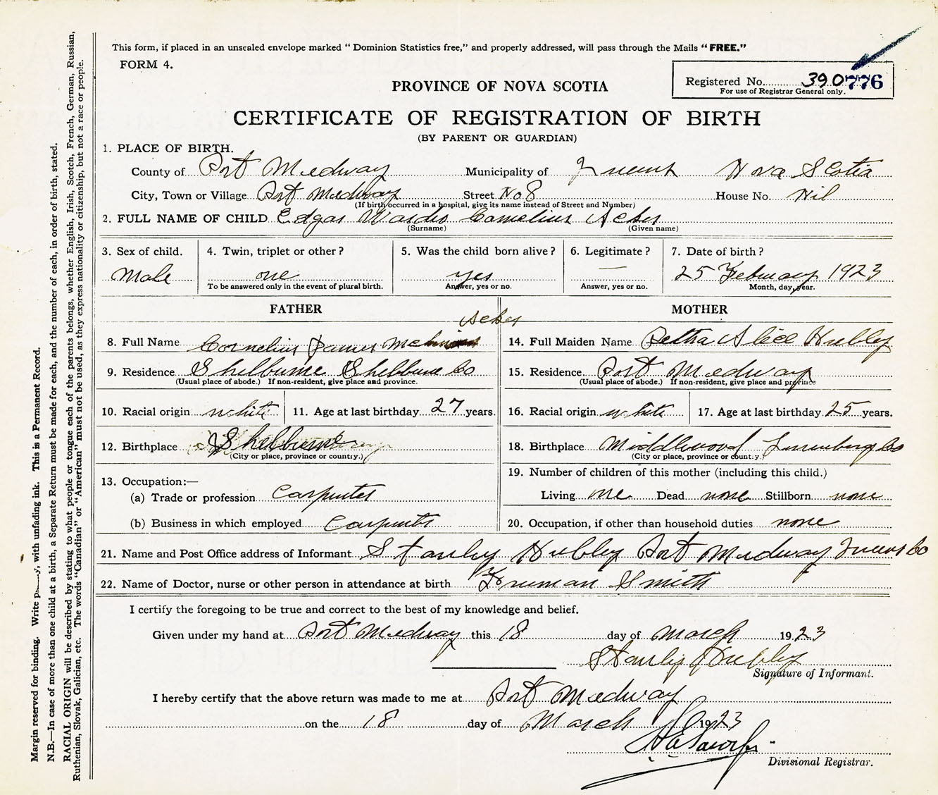Male Birth Registration: Year: 1923 number: 39000776