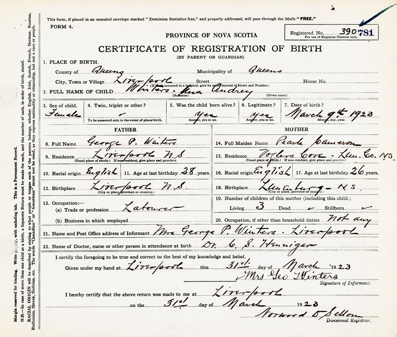 Female Birth Registration: Year: 1923 number: 39000781