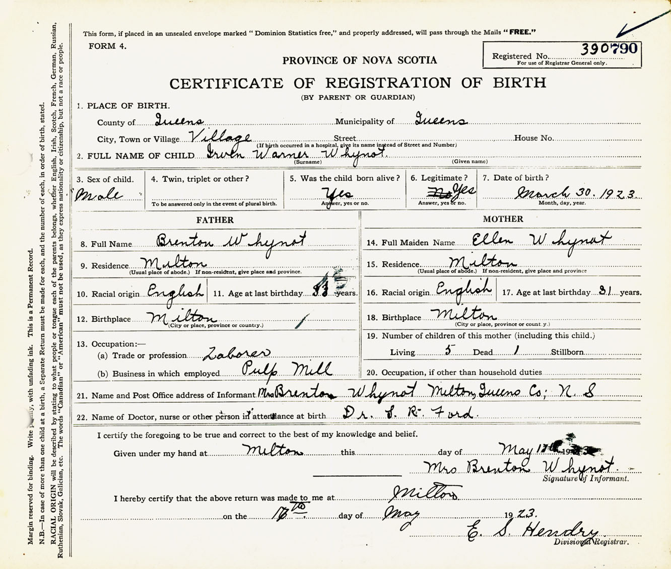 Male Birth Registration: Year: 1923 number: 39000790
