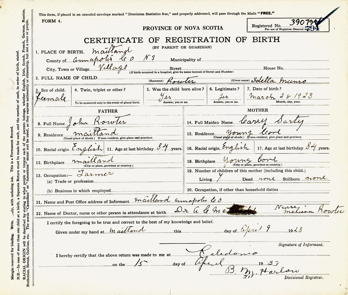 Female Birth Registration: Year: 1923 number: 39000794