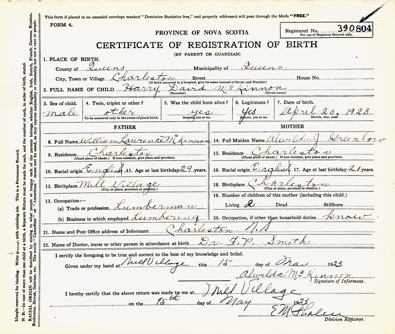 Male Birth Registration: Year: 1923 number: 39000804