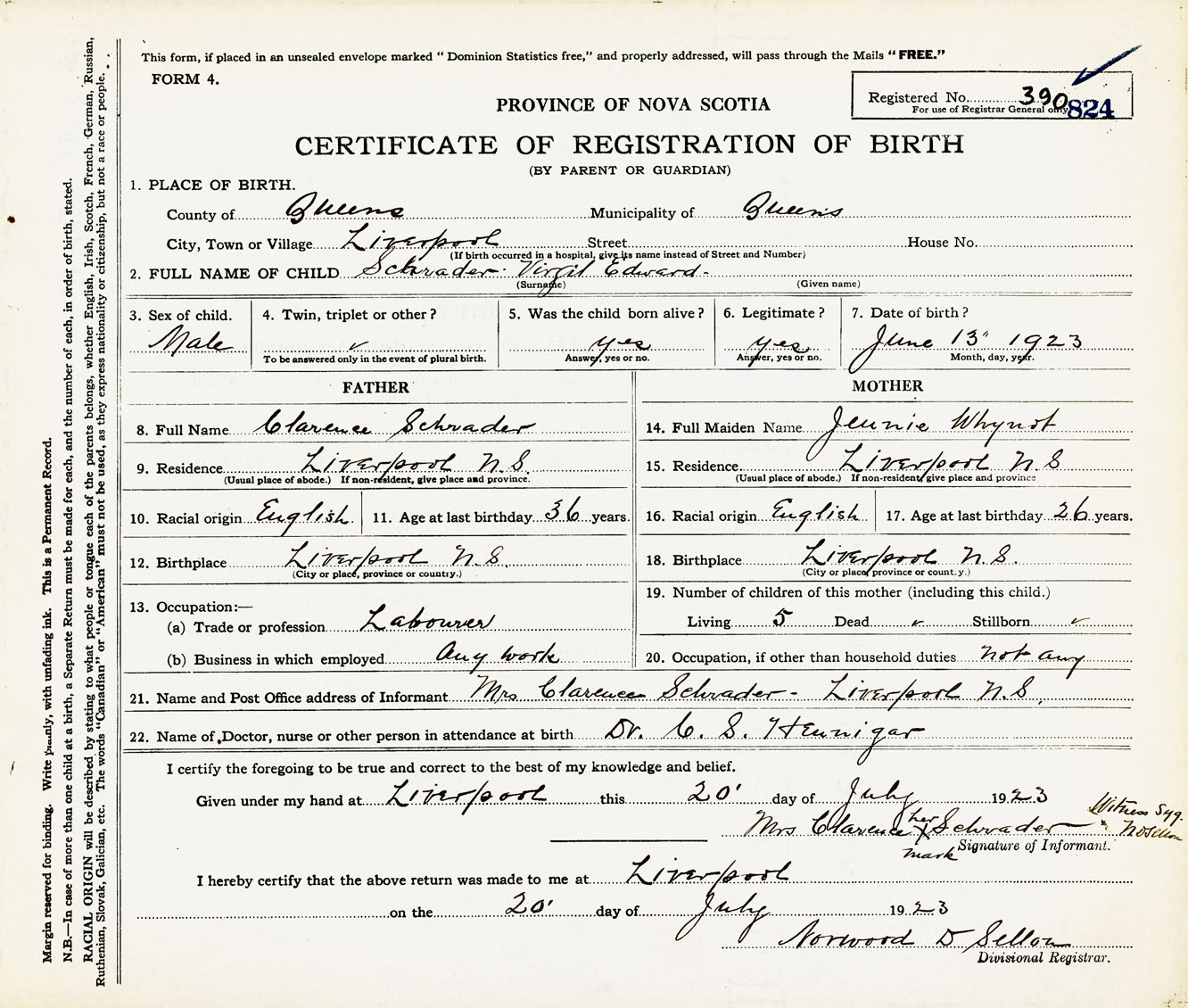Male Birth Registration: Year: 1923 number: 39000824
