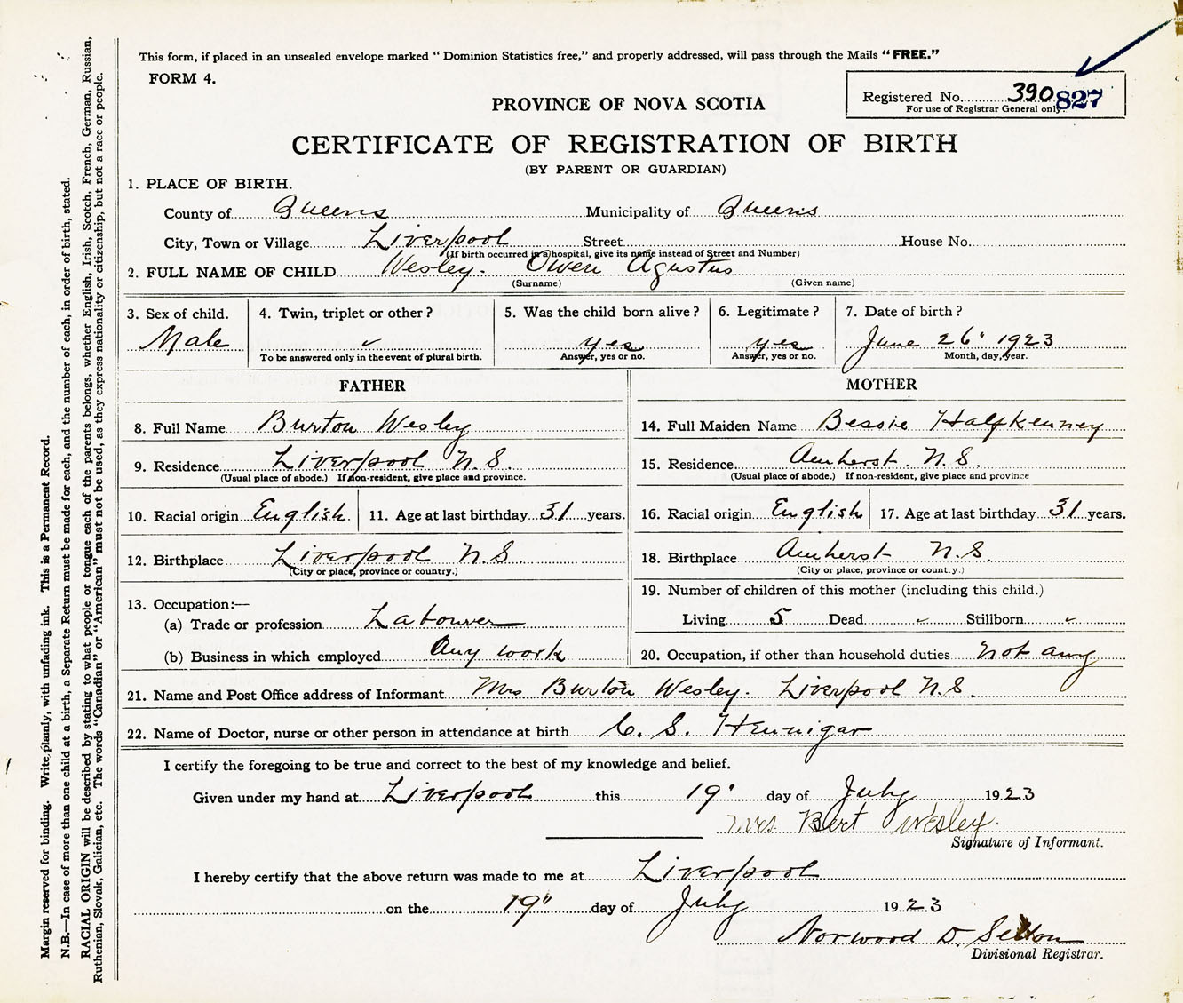 Male Birth Registration: Year: 1923 number: 39000827
