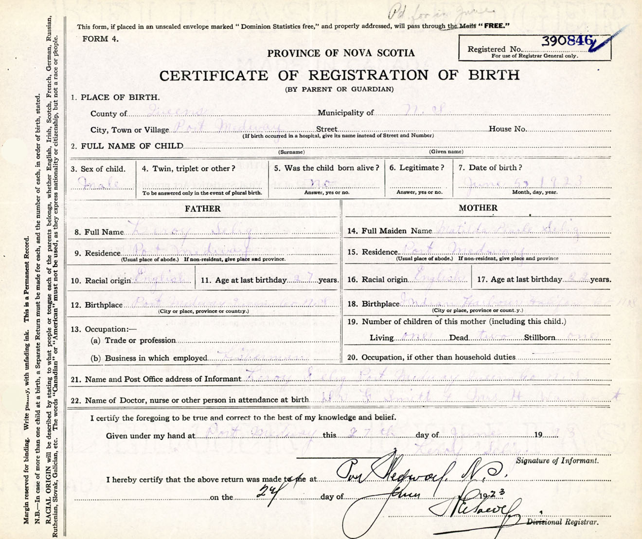 Male Birth Registration: Year: 1923 number: 39000846
