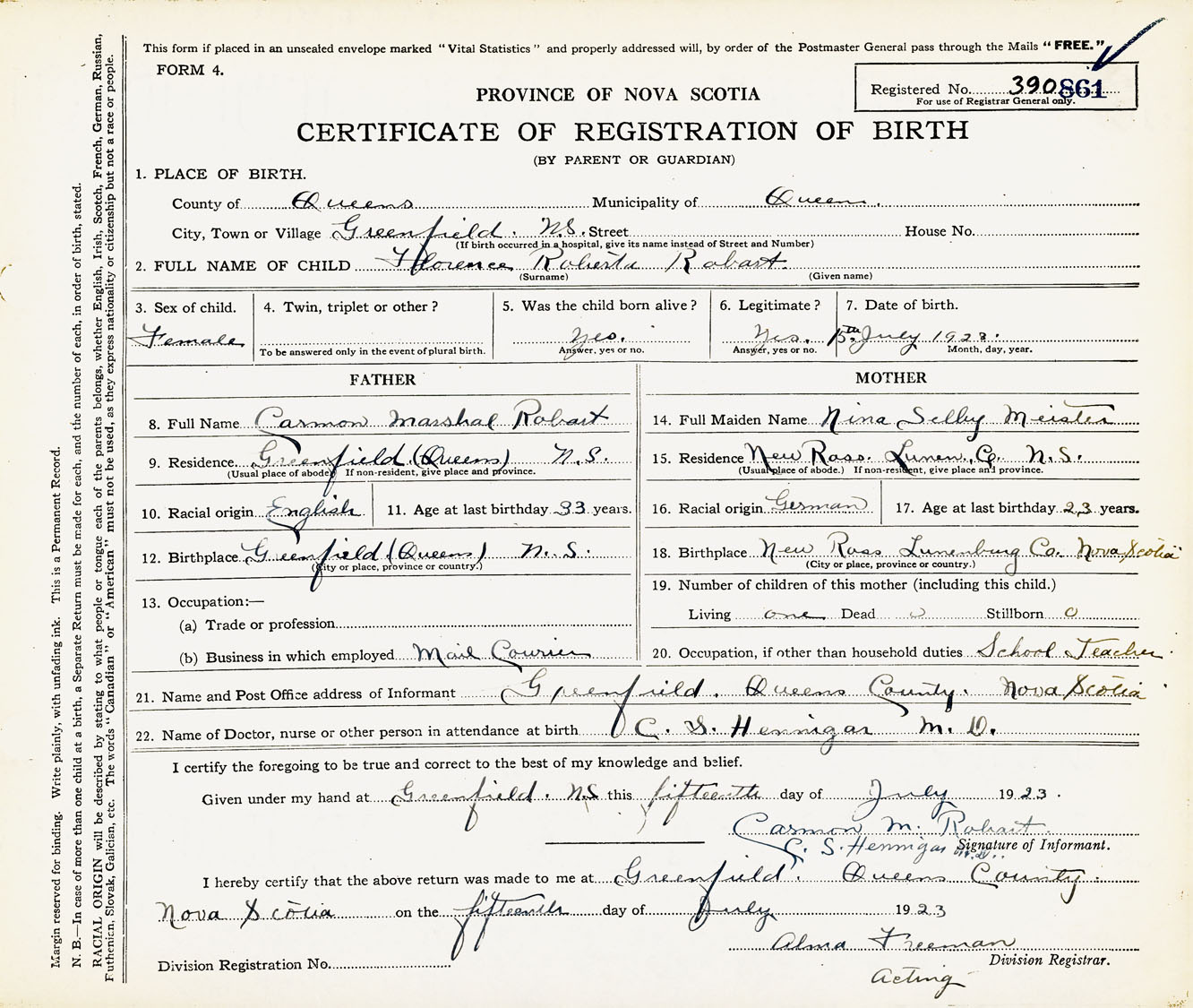Female Birth Registration: Year: 1923 number: 39000861