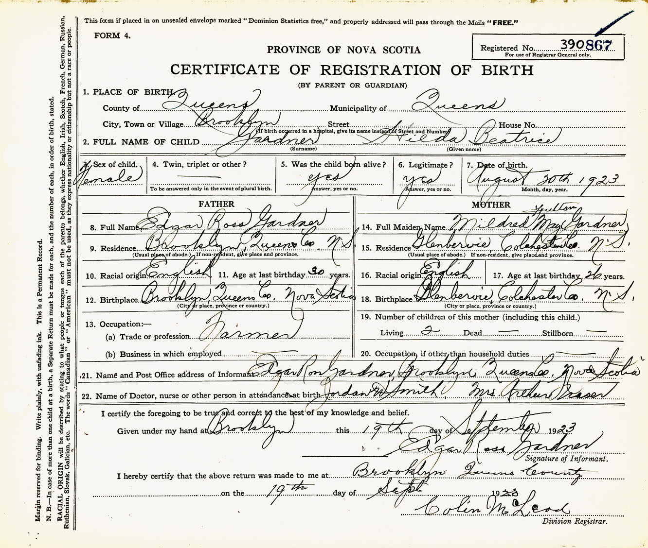 Female Birth Registration: Year: 1923 number: 39000867