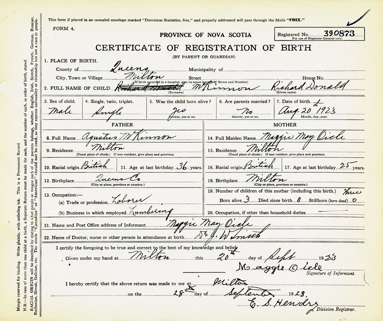 Male Birth Registration: Year: 1923 number: 39000873