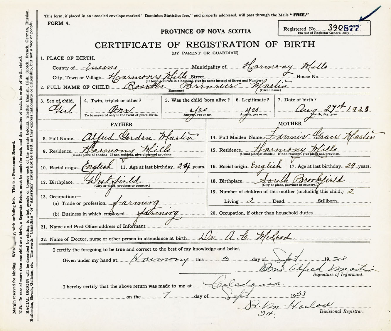 Female Birth Registration: Year: 1923 number: 39000877