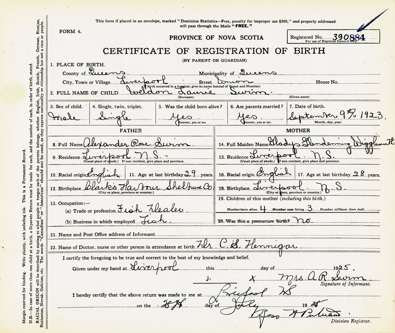 Male Birth Registration: Year: 1923 number: 39000884