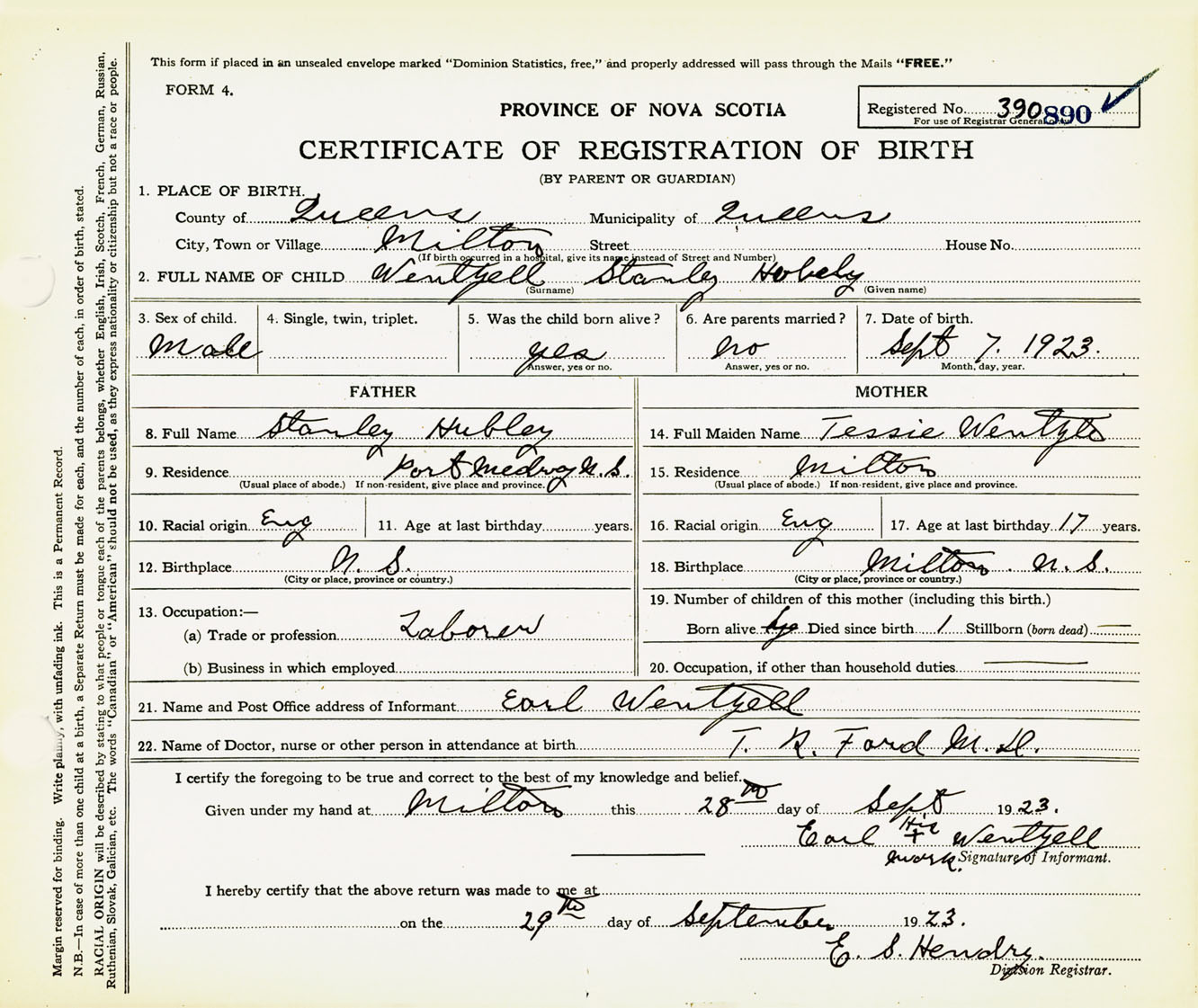 Male Birth Registration: Year: 1923 number: 39000890