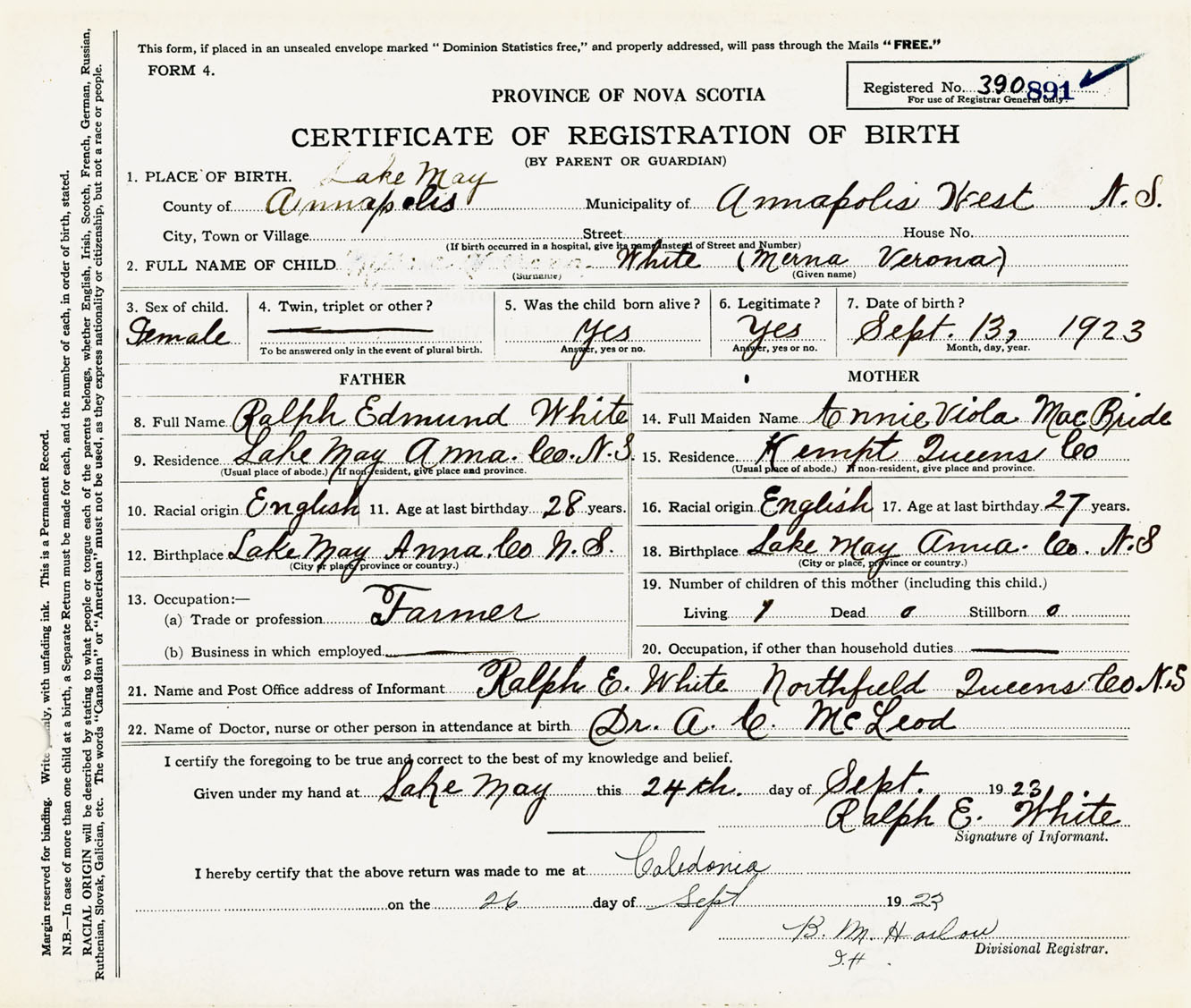Female Birth Registration: Year: 1923 number: 39000891