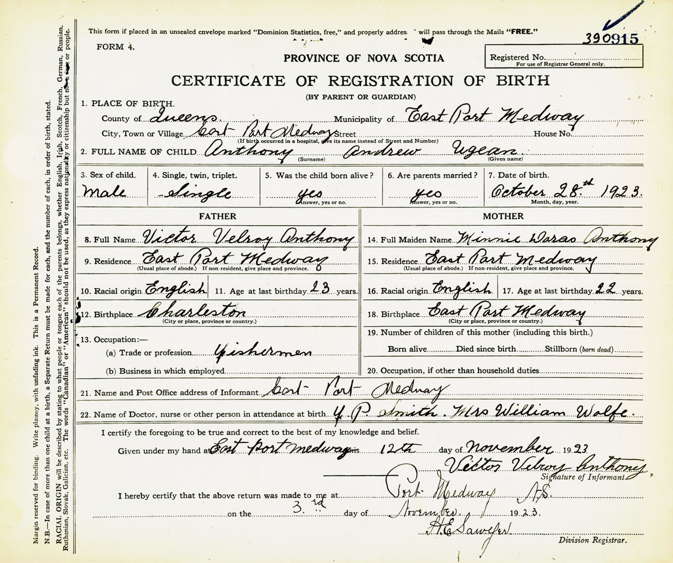 Male Birth Registration: Year: 1923 number: 39000915