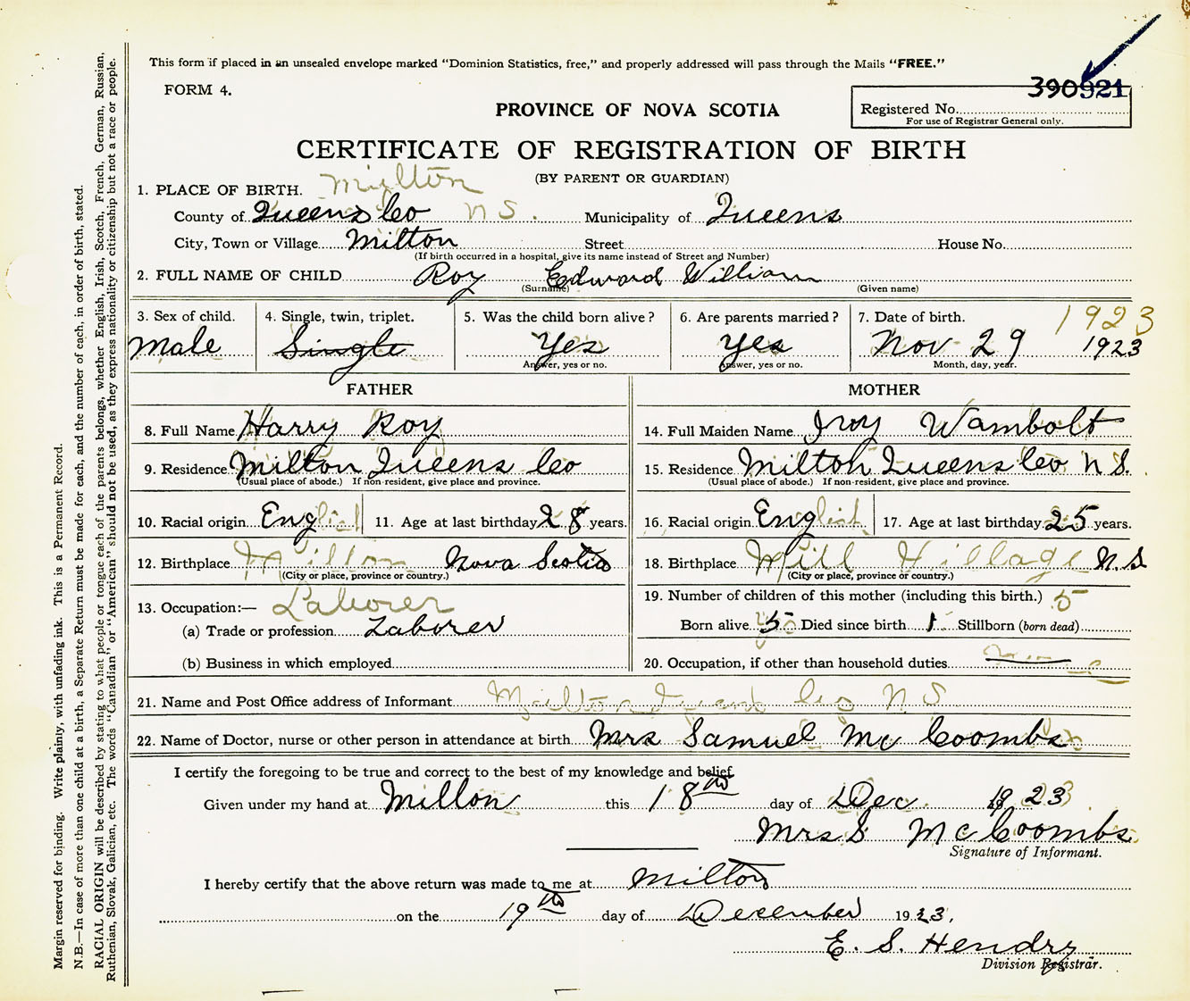 Male Birth Registration: Year: 1923 number: 39000921