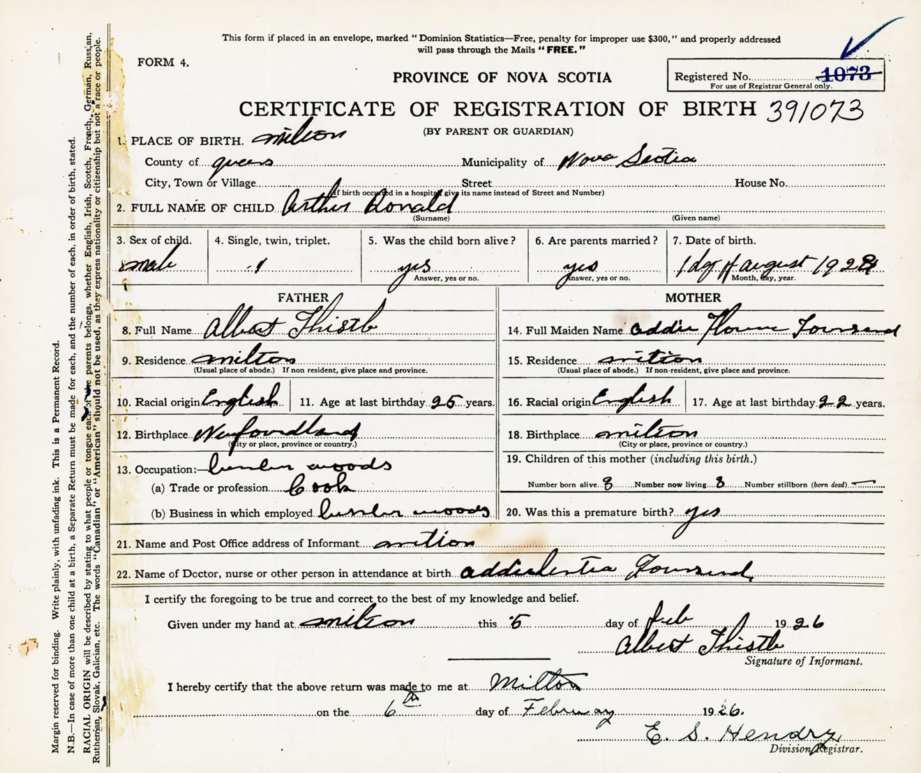 Male Birth Registration: Year: 1923 number: 39100073