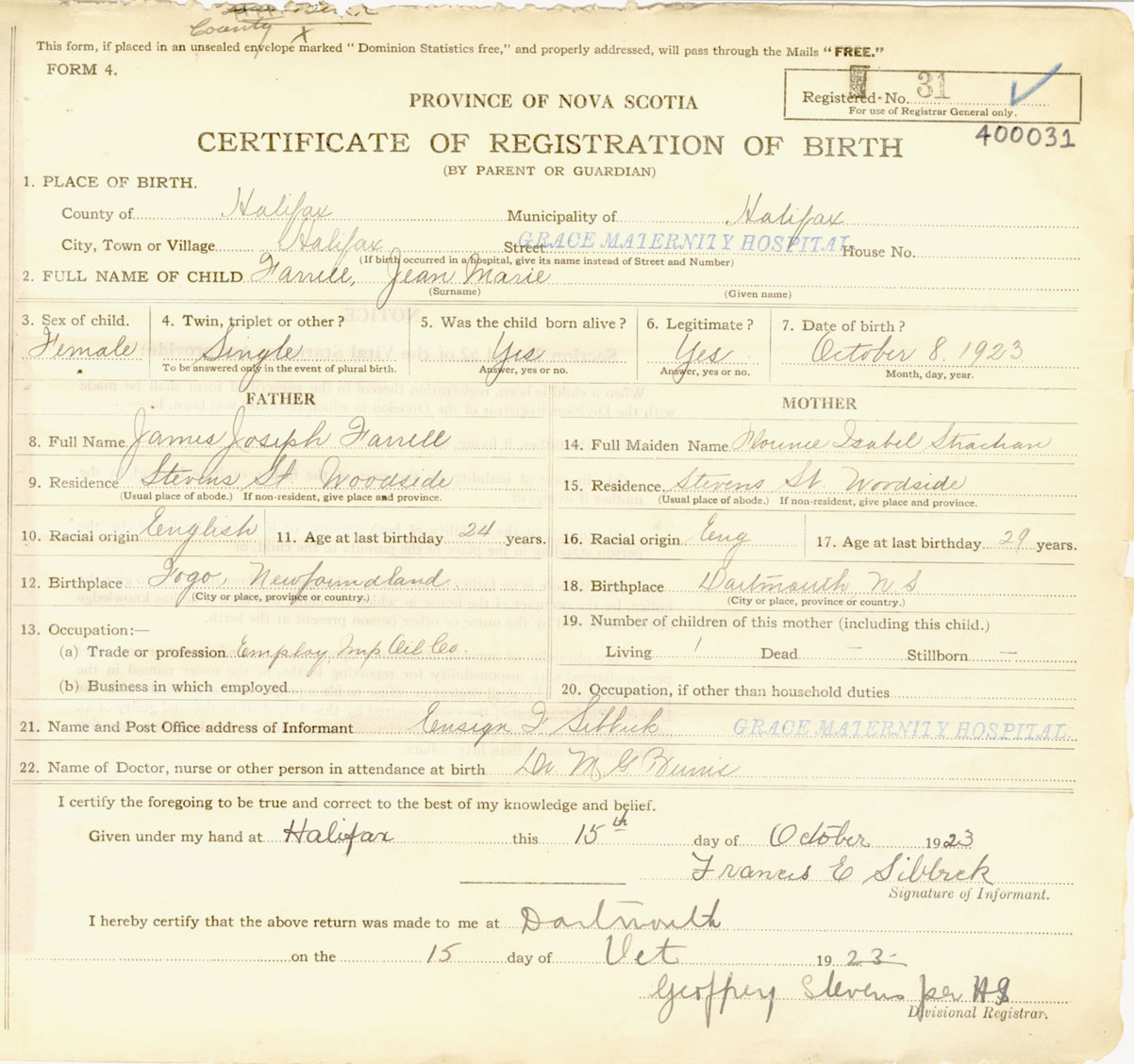 Female Birth Registration: Year: 1923 number: 40000031