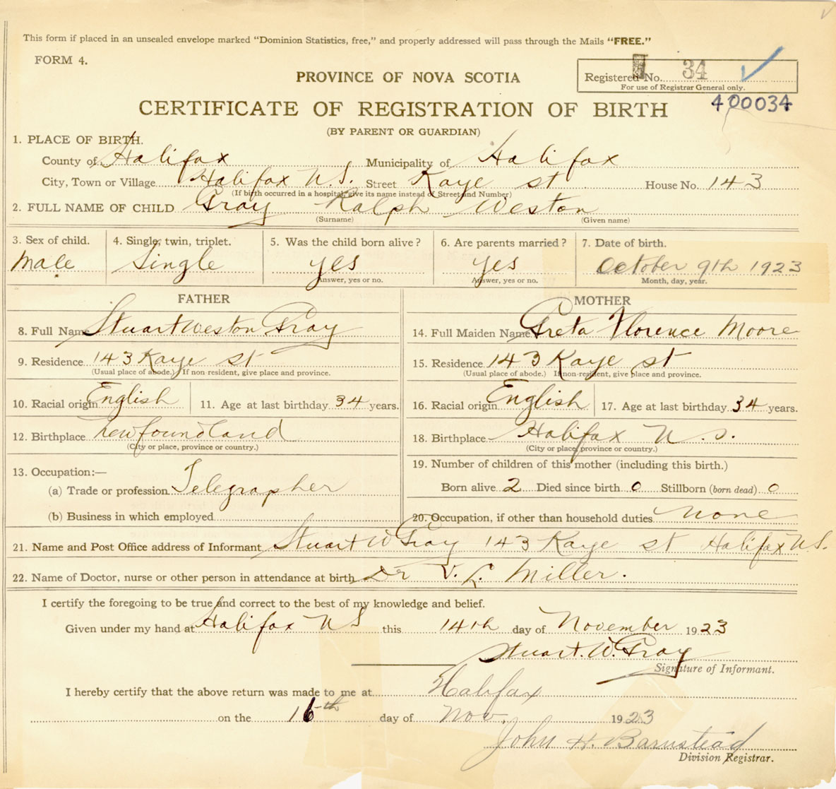 Male Birth Registration: Year: 1923 number: 40000034