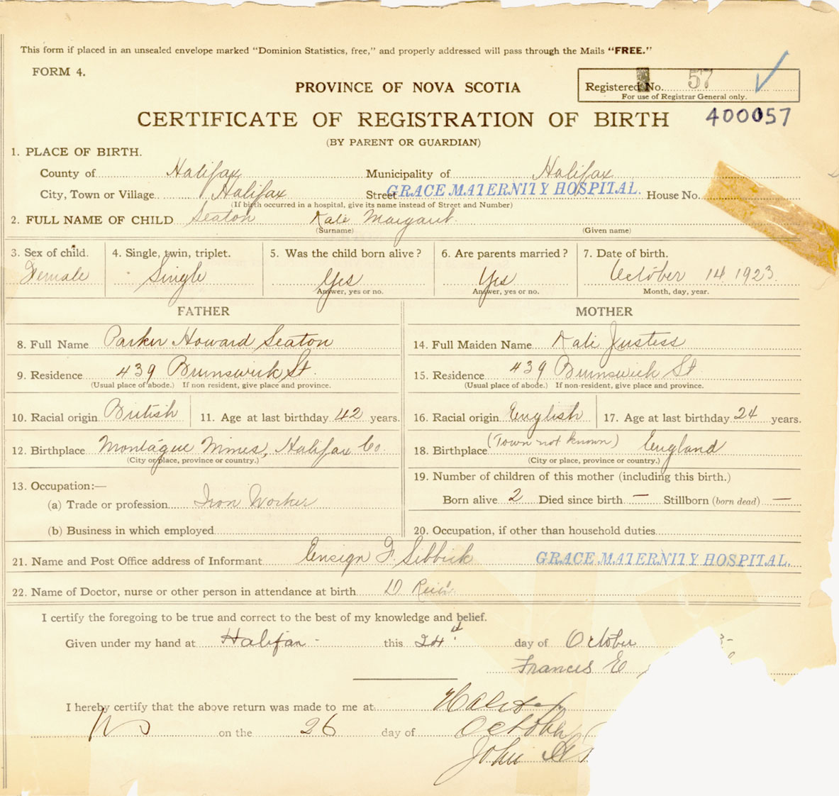 Female Birth Registration: Year: 1923 number: 40000057