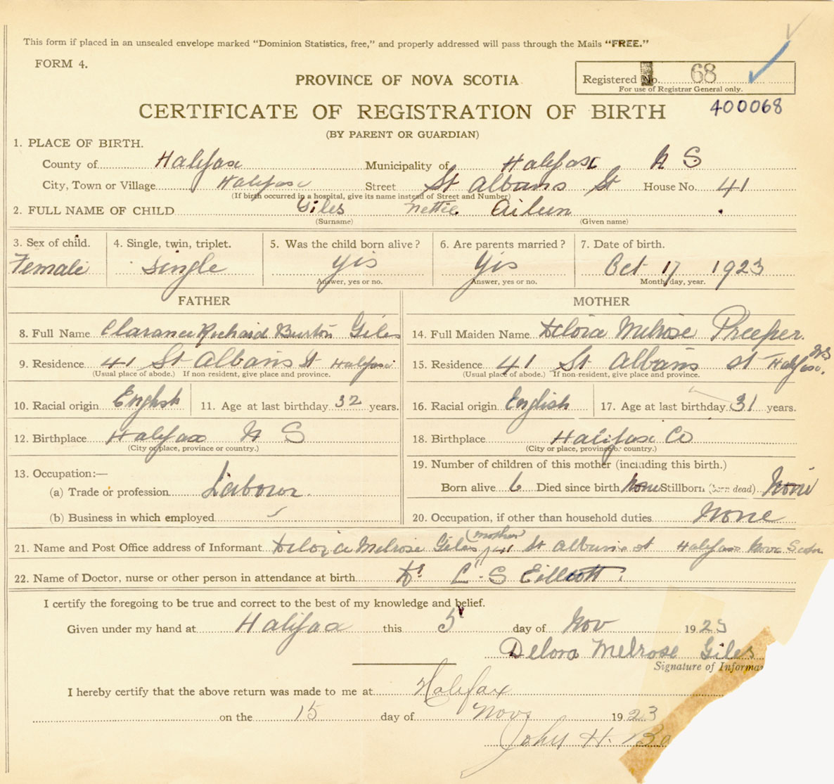 Female Birth Registration: Year: 1923 number: 40000068