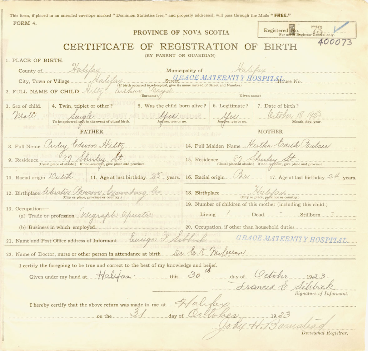 Male Birth Registration: Year: 1923 number: 40000073
