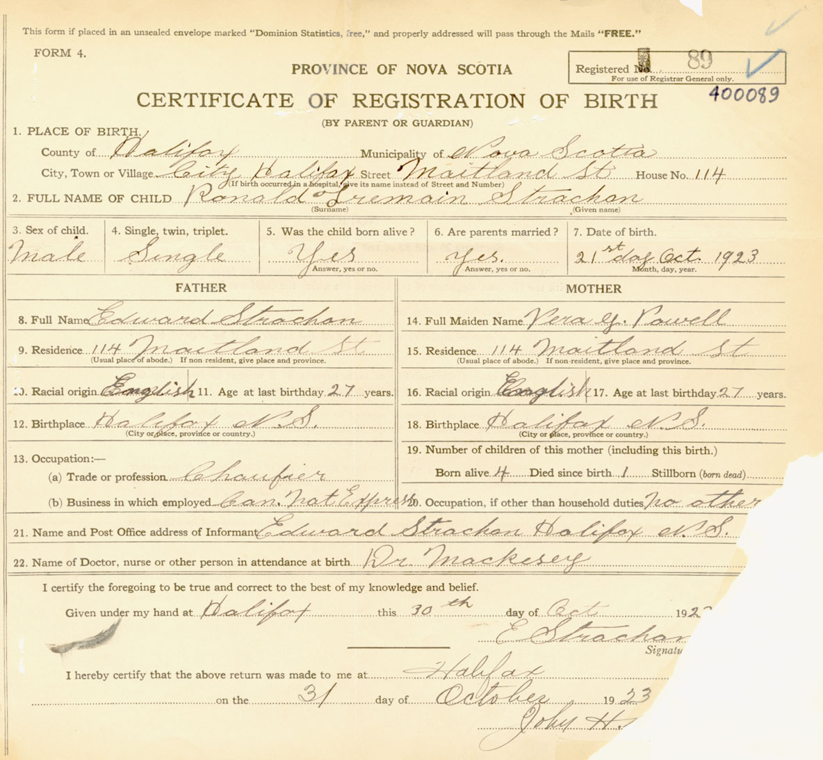 Male Birth Registration: Year: 1923 number: 40000089