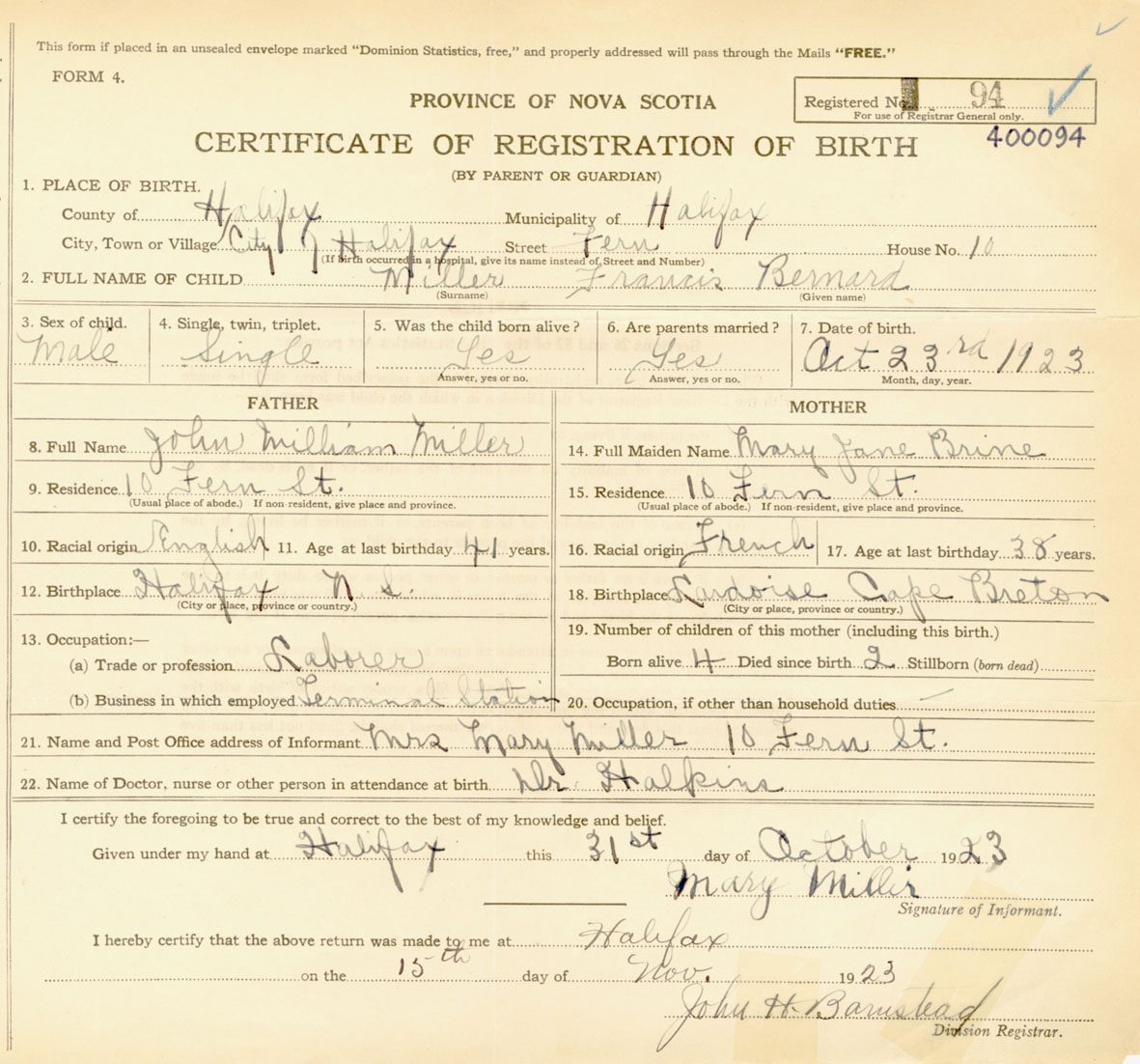 Male Birth Registration: Year: 1923 number: 40000094